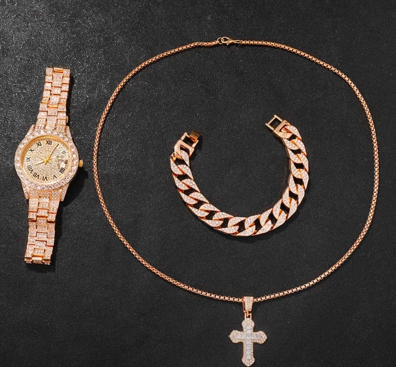 Dale un giro elegante a tu estilo diario con nuestro exquisito conjunto de 3 piezas, que incluye un reloj de moda, una pulsera y un collar de estrás. Este set es perfecto para quienes buscan añadir un toque de sofisticación a su atuendo casual, combinando belleza y funcionalidad.