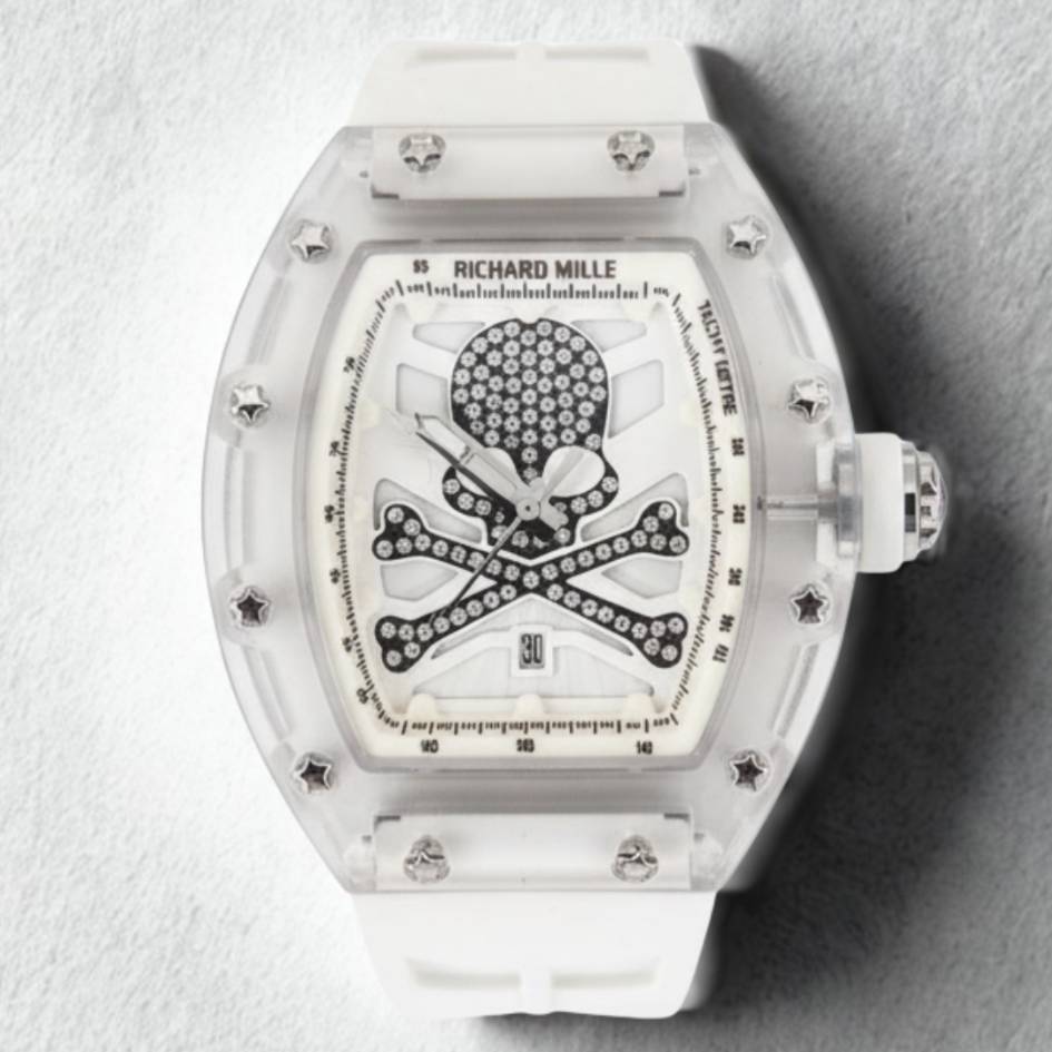 El Reloj Richard Mille Edición Calavera Blanca es una pieza que fusiona el lujo contemporáneo con un diseño vanguardista y audaz. Su caja de forma tonneau transparente deja entrever el complejo sistema interno, símbolo de ingeniería y sofisticación. Fabricado con materiales de alta resistencia, combina ligereza y durabilidad, manteniendo el estilo característico de la marca.
