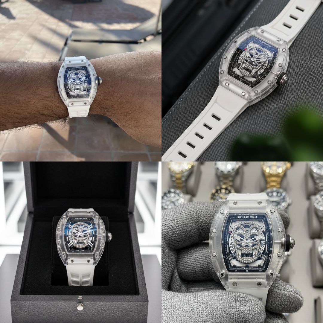 El Reloj Richard Mille Skull Blanco presenta un diseño audaz y moderno que destaca por su caja transparente y su impactante esfera con forma de calavera, decorada con detalles brillantes que le aportan un estilo distintivo y lleno de carácter.
